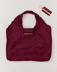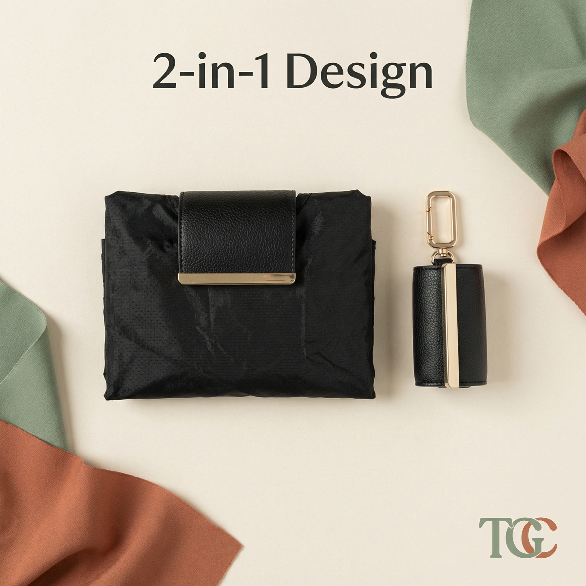 The Good Carry folds from a tiny 3.5×2″ keychain into a spacious 20×24″ tote, crafted with a pebbled recycled vegan leather panel and a durable nylon body. It's rip- and water-resistant, features tarnish-resistant matte gold or silver hardware, and supports up to 50 lbs—perfect for everyday use.