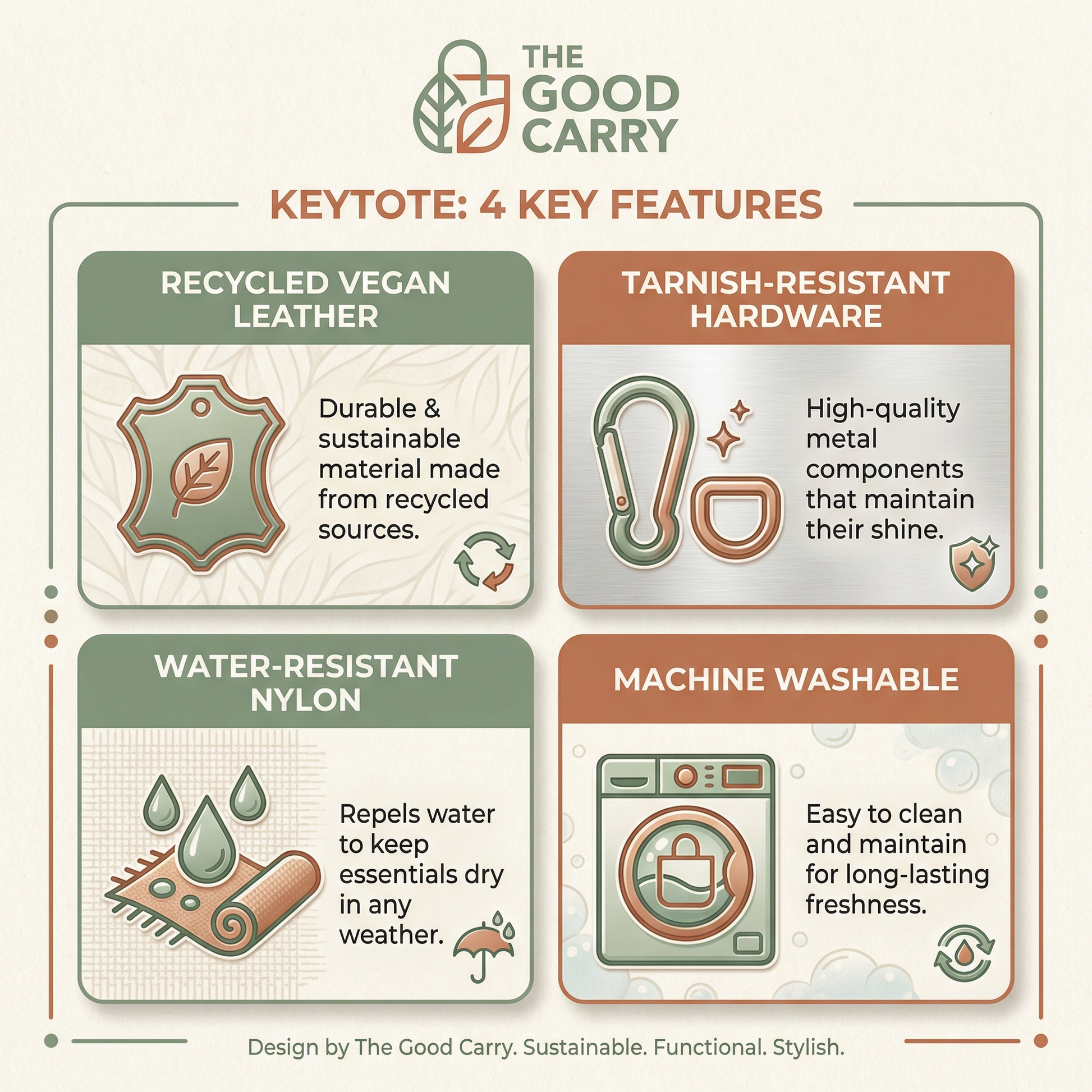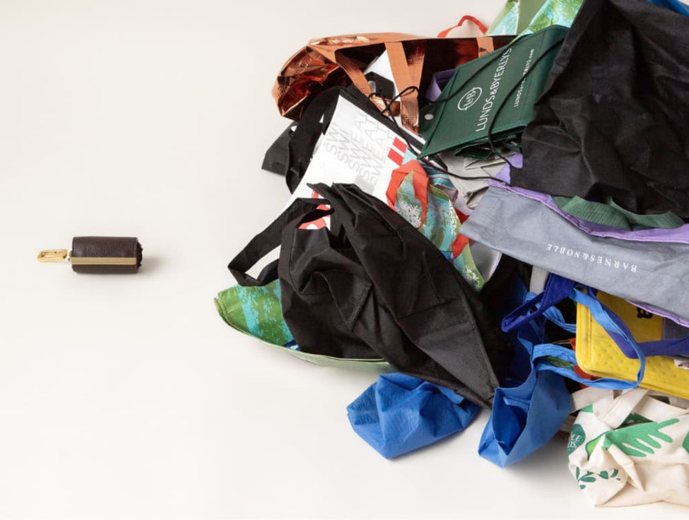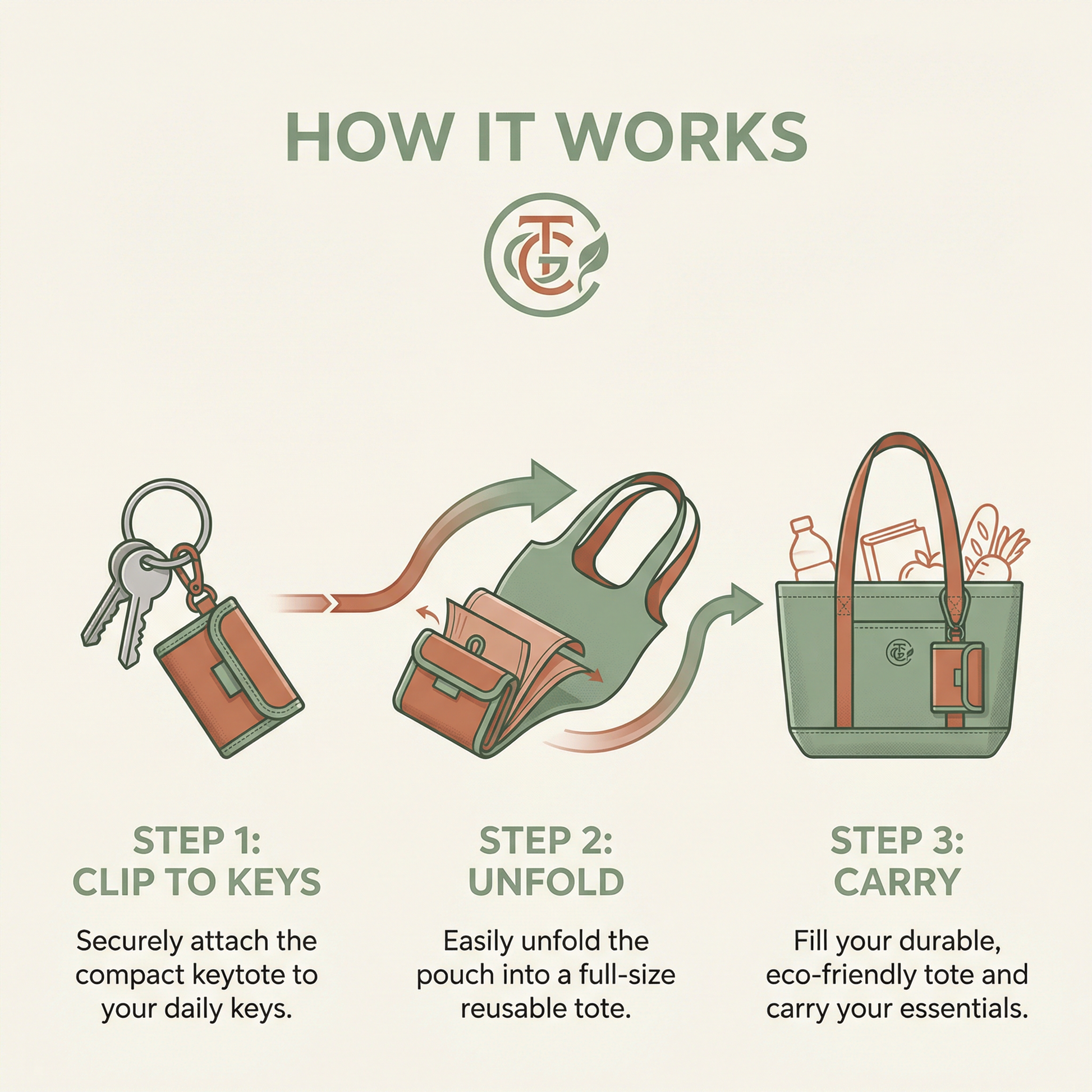 Instant keychain-to-tote transformation Holds up to 50 lbs Eco-chic single-use plastic replacer Stylish pebbled vegan leather